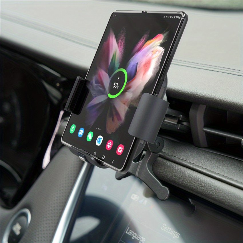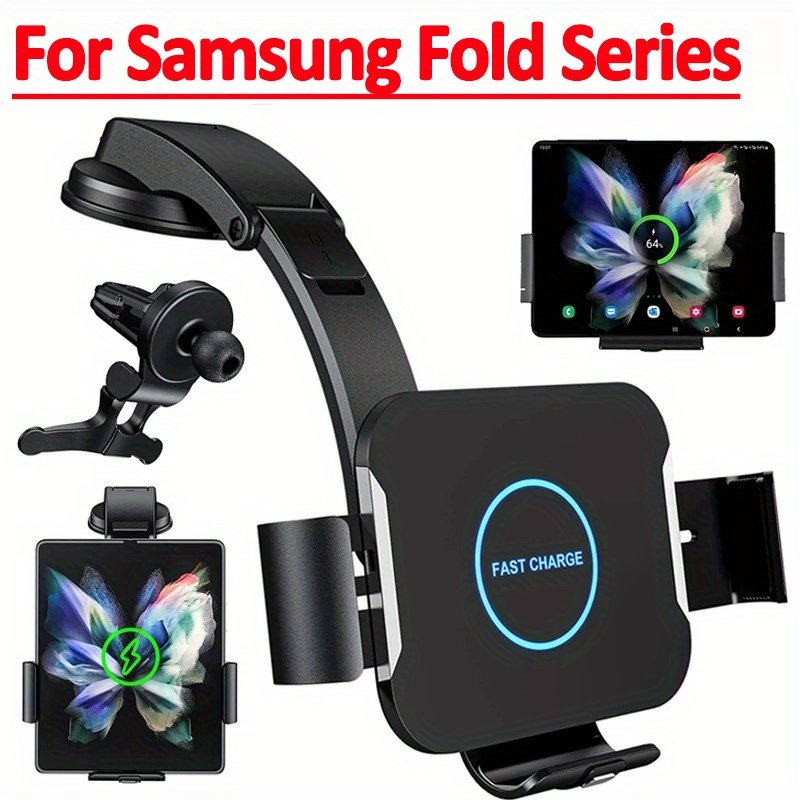 Features:1, Magnetic Sensor and Motor Opening/Closing. Charges your phone automatically when it is placed into the holder.2, Two side on/off button for easy detachment of your smartphone with just one hand, convenience & safe driving.3, Fast and FOD production, Safety charing.4, 3 in 1 solution: attaches to car window, dashboard or air vent with included accessories.5, Adjustable angle and 360 degree rotatable.6, For Samsung Galaxy Fold and Huawei Mate X mobile phone.7, Works with any car USB ch