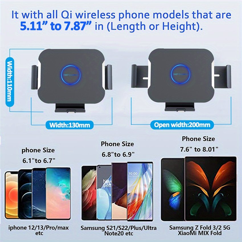 Intelligent Automatic Sensing Clamping: Put the phone close to the phone holder, with the built-in smart sensors, the phone holder will release the clips, and then it will automatically clamp and start charging. Touch the button sensing area softly, the clips will release your phone automatically, then you can get the phone. Extra wide clips can hold Samsung Galaxy Z Fold2 tightly.