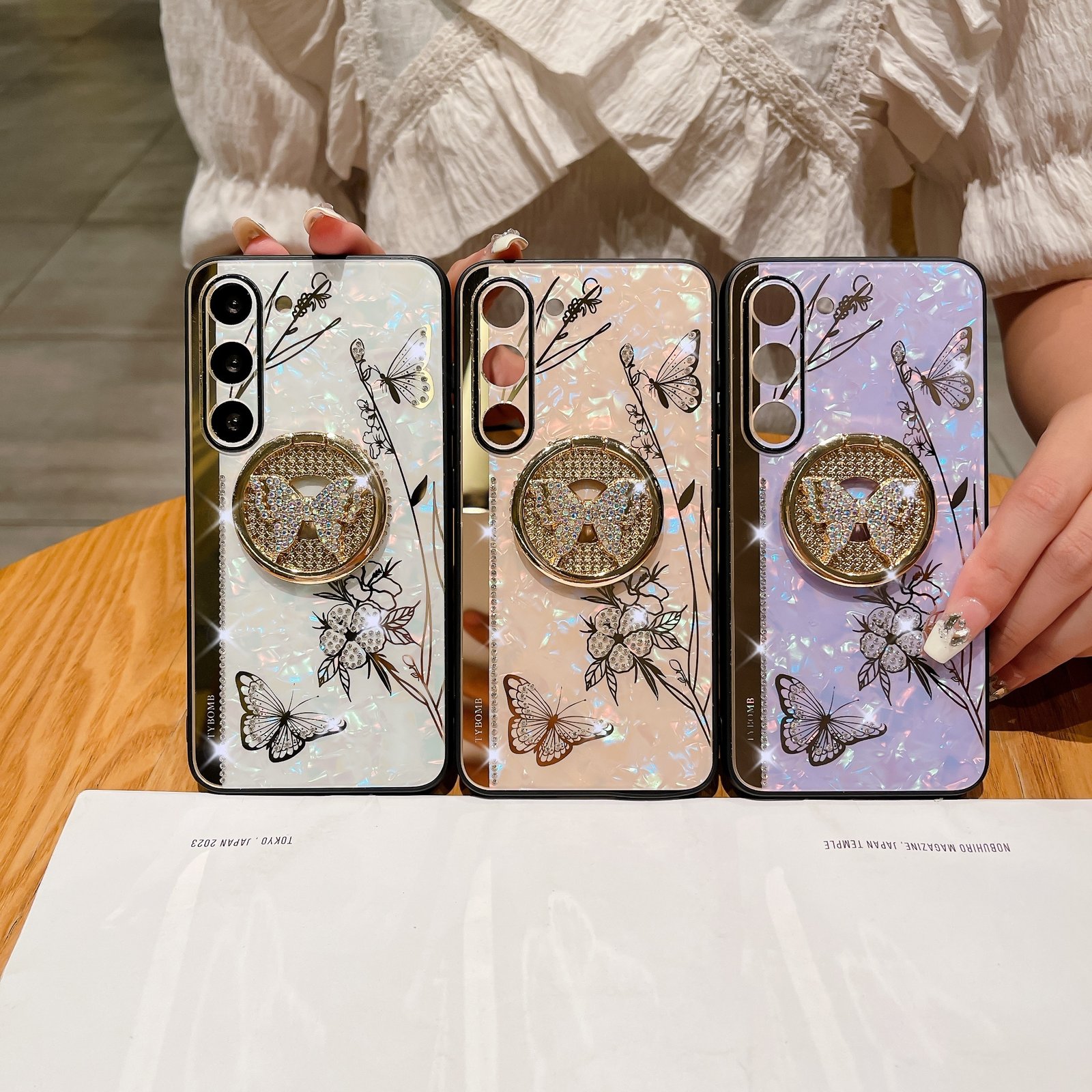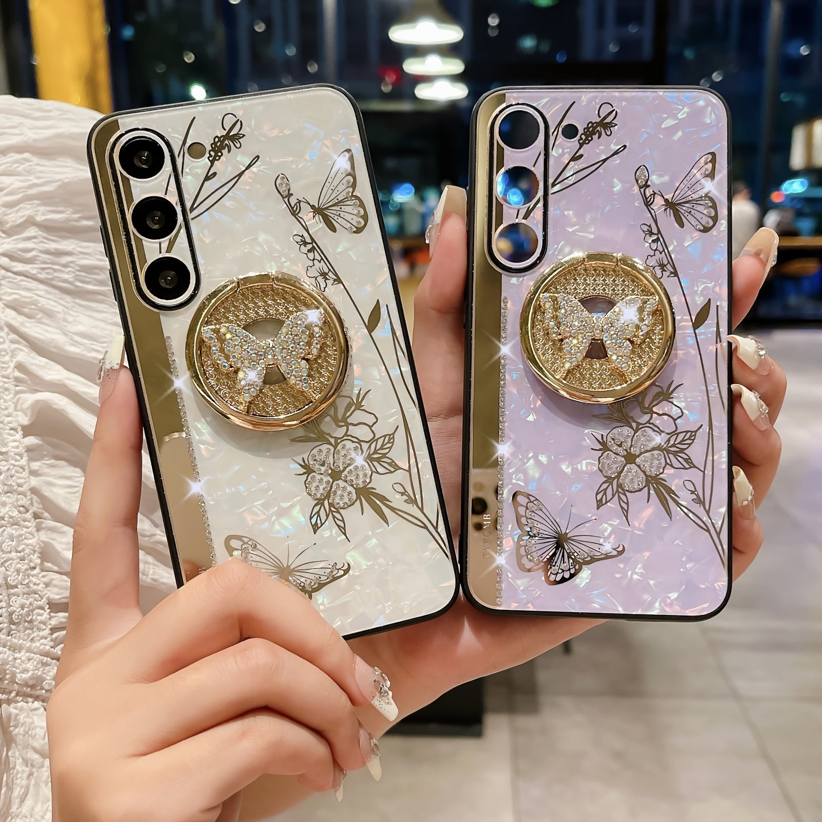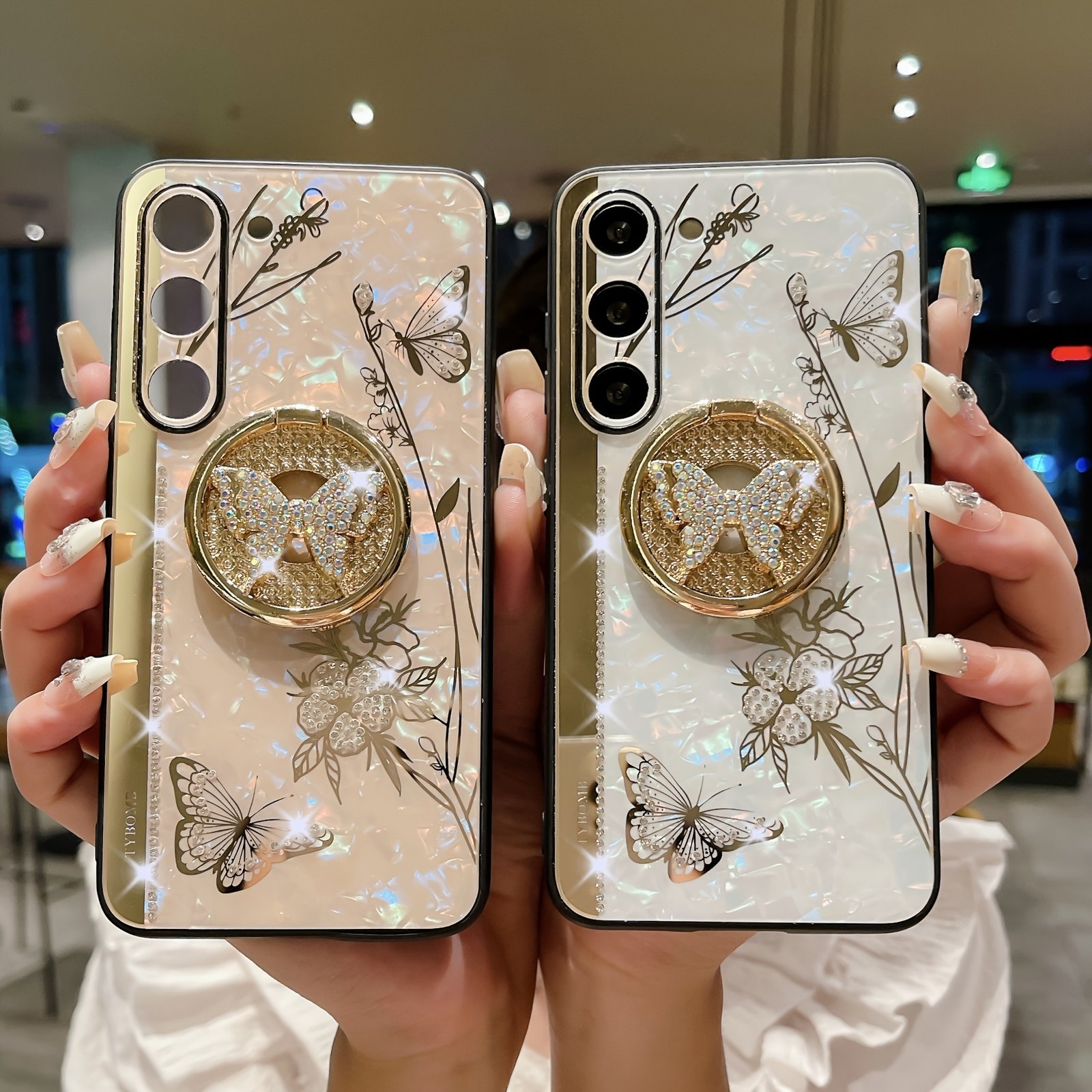 For Samsung Galaxy S23 FE/S23+/S23/S22+/S22/S21 Ultra/S21+/S21/A52 Phone Case Ladies Girl, Luxury Cute Sparkling Rhinestone Butterfly Flower Design With Ring Stand, Electroplated Glitter Girl Hard Case